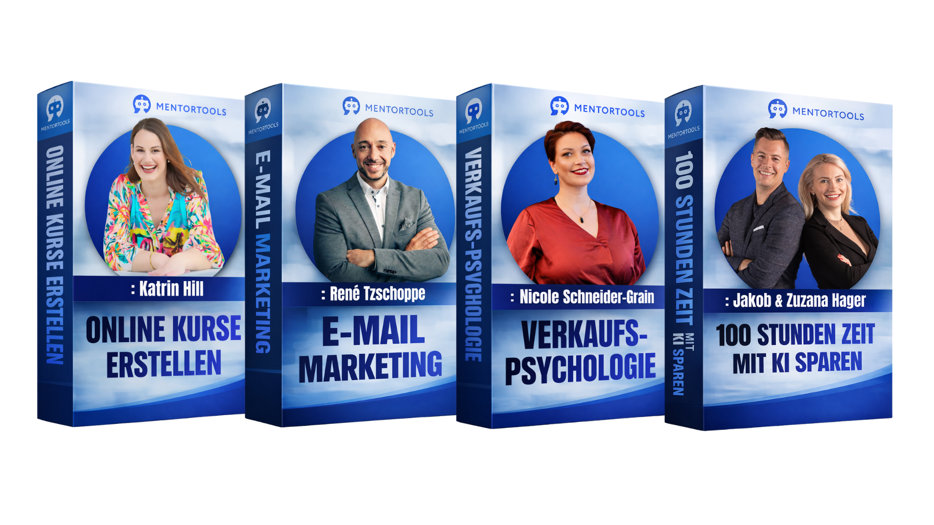 In diesem Paket bekommst du 4 Kurse von Top-Kurserstellern bei Mentortools zu den Themen Online Kurs Erstellung, Leadgenerierung & E-Mail Marketing, Profiling und Verkaufspsychologie und zu den neusten Methoden um KI einzusetzen um 100 Stunden Arbeit zu sparen.