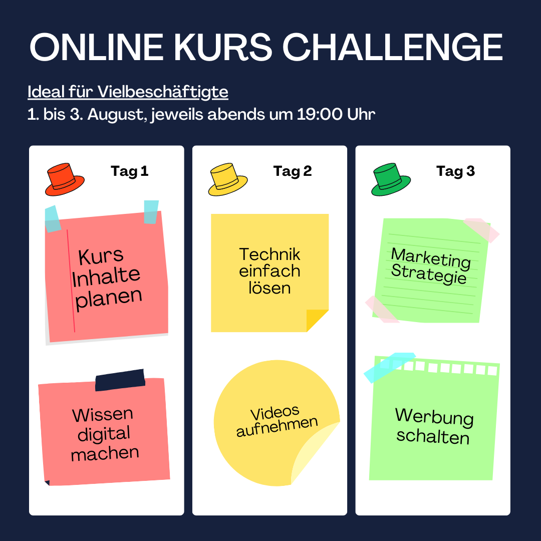 Die meisten Menschen denken, es würde Wochen oder sogar Monate dauern um einen Online Kurs zu erstellen. Erfahre in der Challenge, worauf es wirklich ankommt und was die wichtigsten Aufgaben sind, um in nur 3 Tage Ergebnisse zu haben.